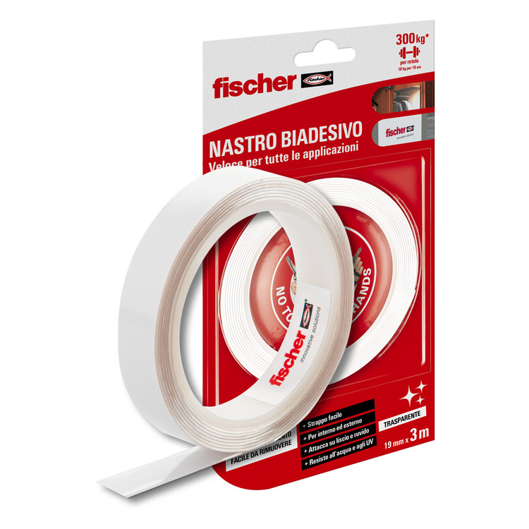 Nastro biadesivo trasparente. Strappo facile e preciso. Resistente fino a 10kg con soli 10cm di nastro!