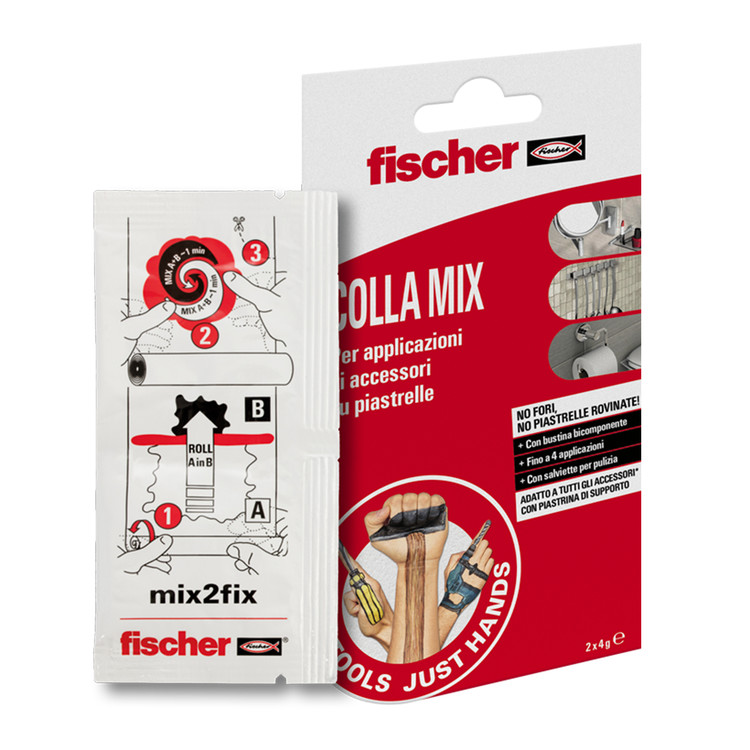 Colla bicomponente in bustine monodose per incollare gli accessori sulle piastrelle. Ideale per piccole applicazioni senza rischio di sprechi e senza forare.